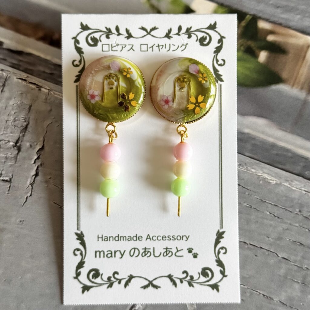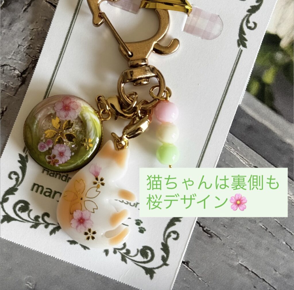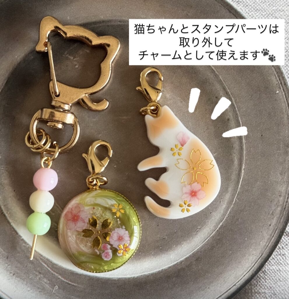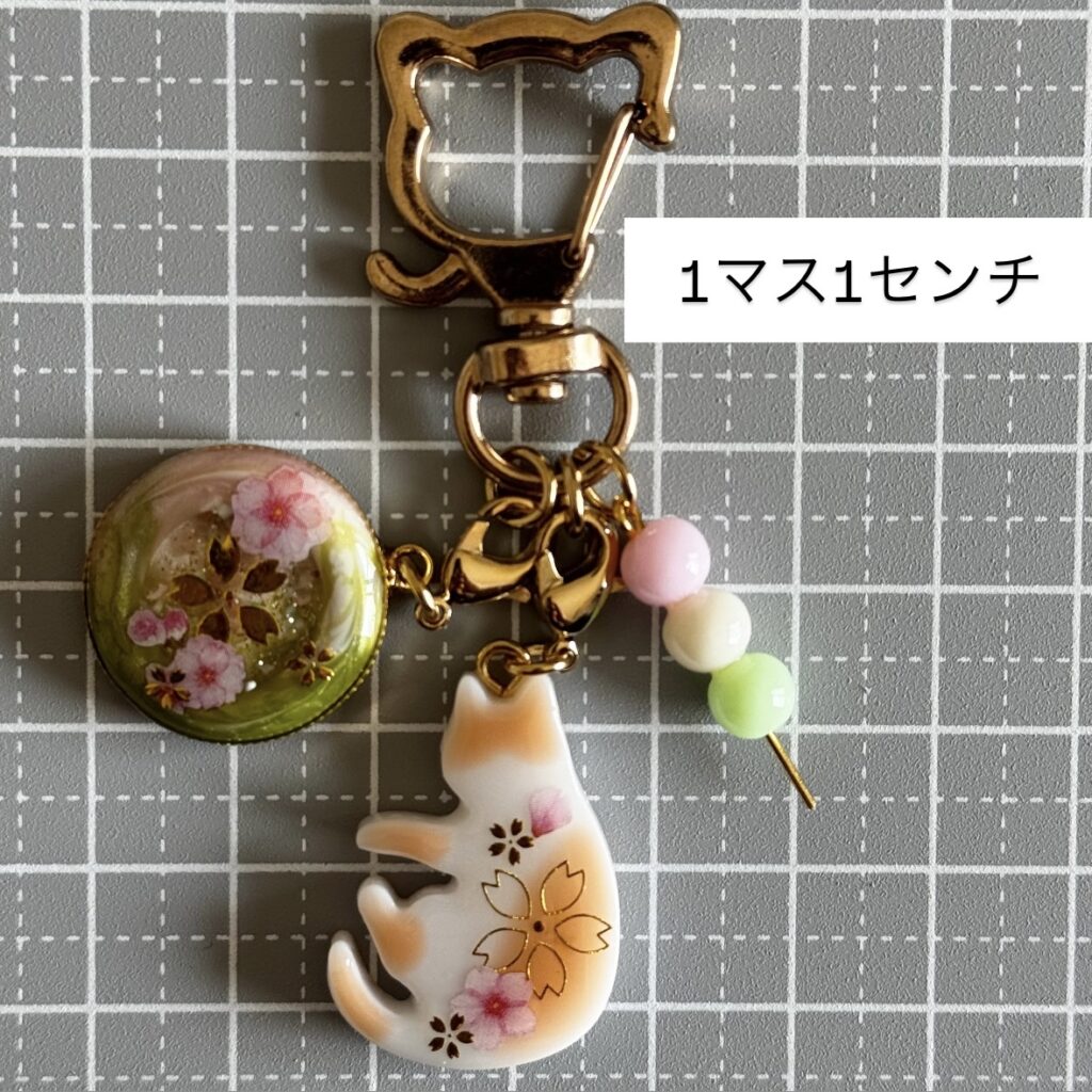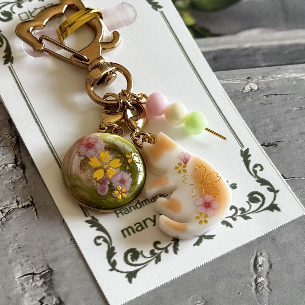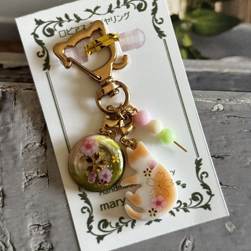淡い毛色が可愛い、ころりんとした茶白猫と花見団子をイメージしたキーホルダーです🍡