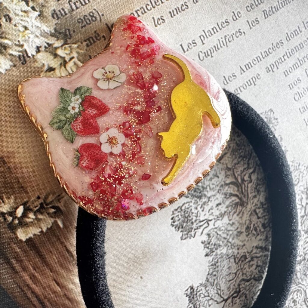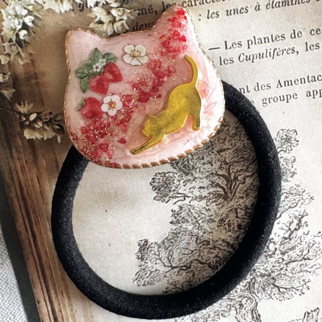 伸びをしている猫ちゃんが可愛い、いちごカラーのヘアゴムです🐈
